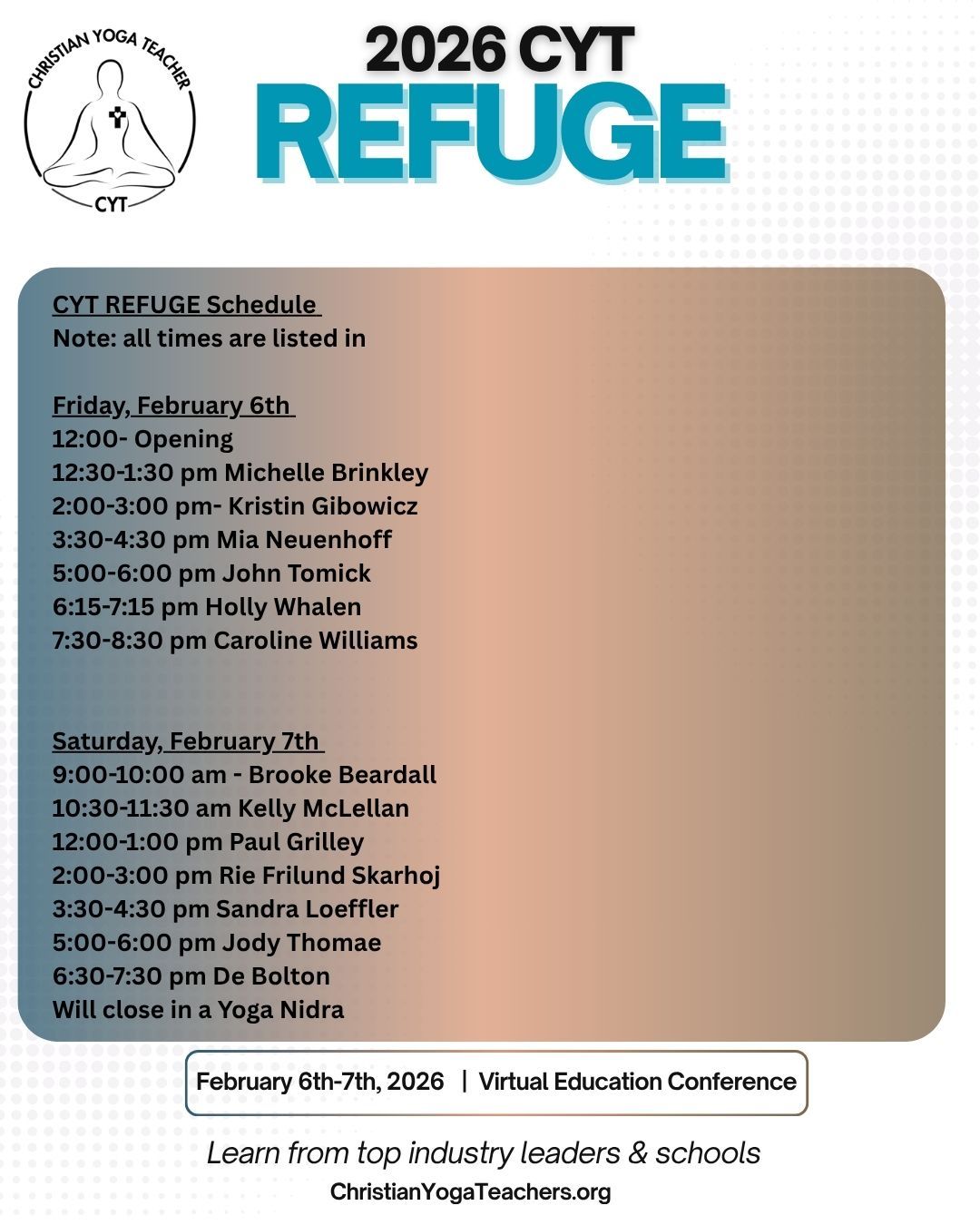 We are thrilled to announce the upcoming Online CYT Education Conference — CYT REFUGE: A Safe Place for Integrated Learning. This is an opportunity for those around the world who cannot gather in person at our Revival to still connect and join in this community.